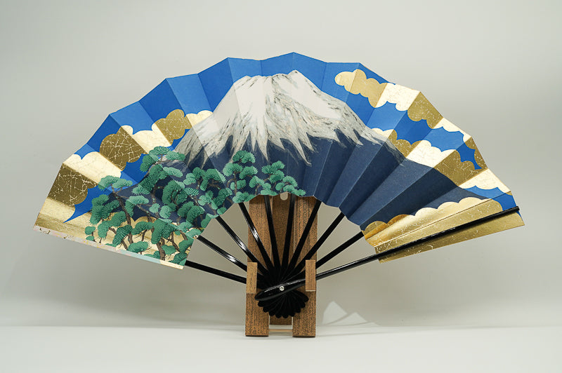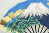 金もみ地の扇面に富士山と金の雲、松、もう片面には金箔地に桜が描かれています。日本の象徴である富士山と桜は外国の方にも人気があり、日本土産や贈物にもぴったりのデザインです。季節やお好みに合わせて両面お使いいただけます。