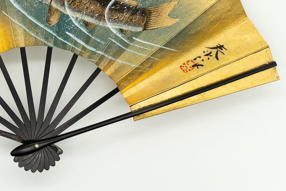 【一点もの】金箔を手で揉みこんで扇面に箔押した金もみ地に涼やかな川で優雅に泳ぐ鯉を手描きで描いています。もう片面にはあやめをあしらい、雰囲気に合わせて両面お使い頂けます。