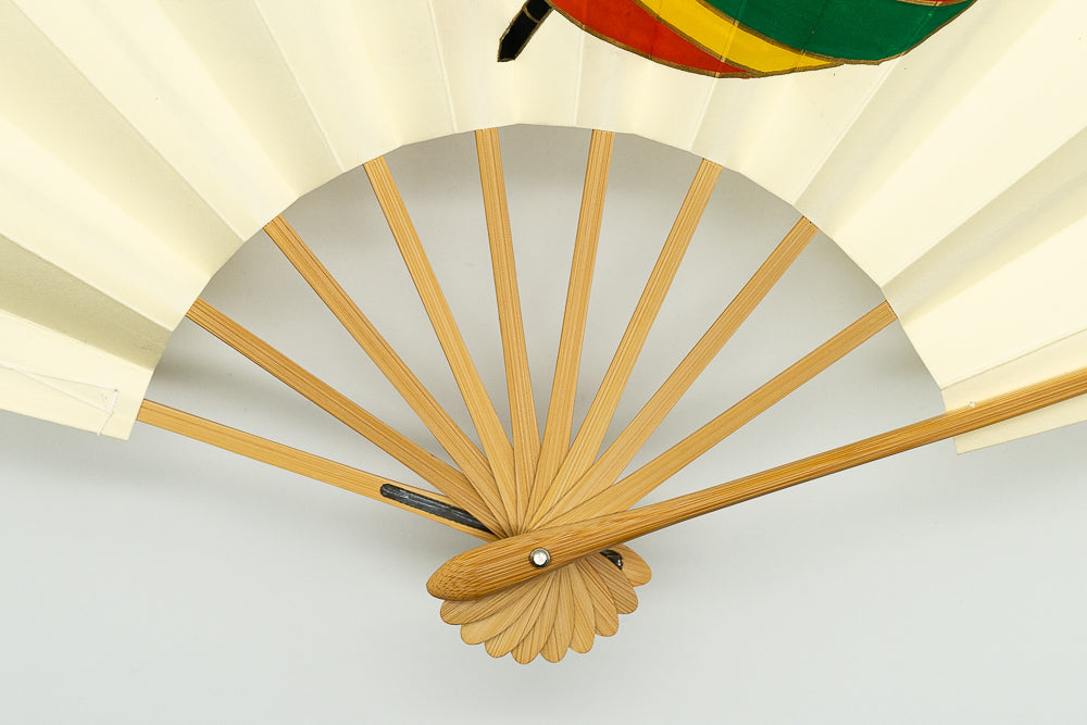 鳥の子地の扇面に手描きで独楽が描かれています。日本舞踊の演目「独楽」で使用される絵柄です。