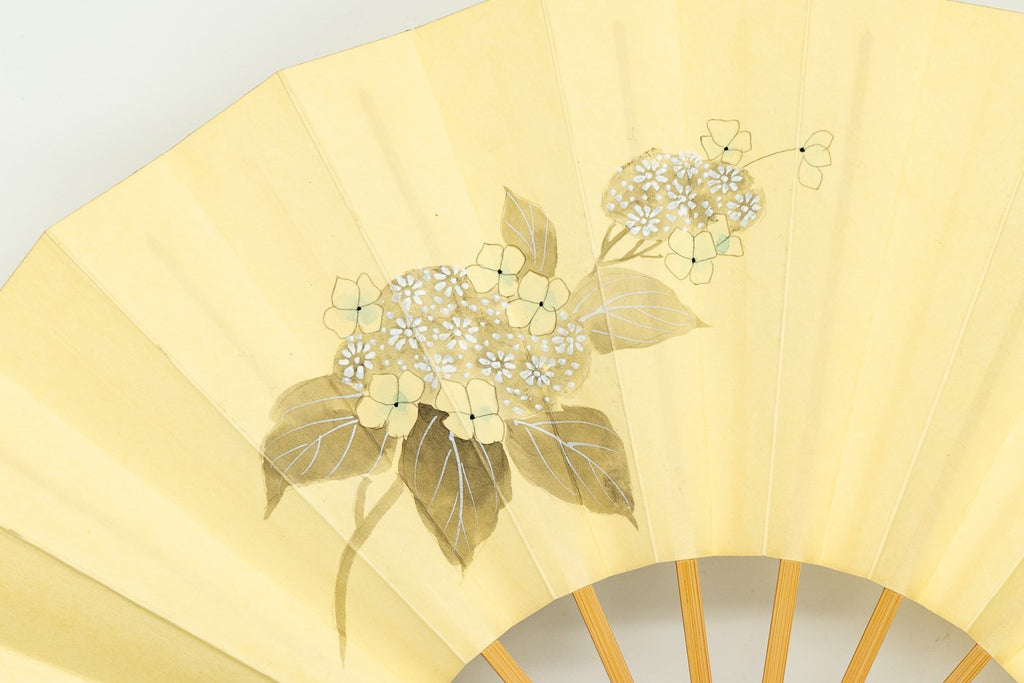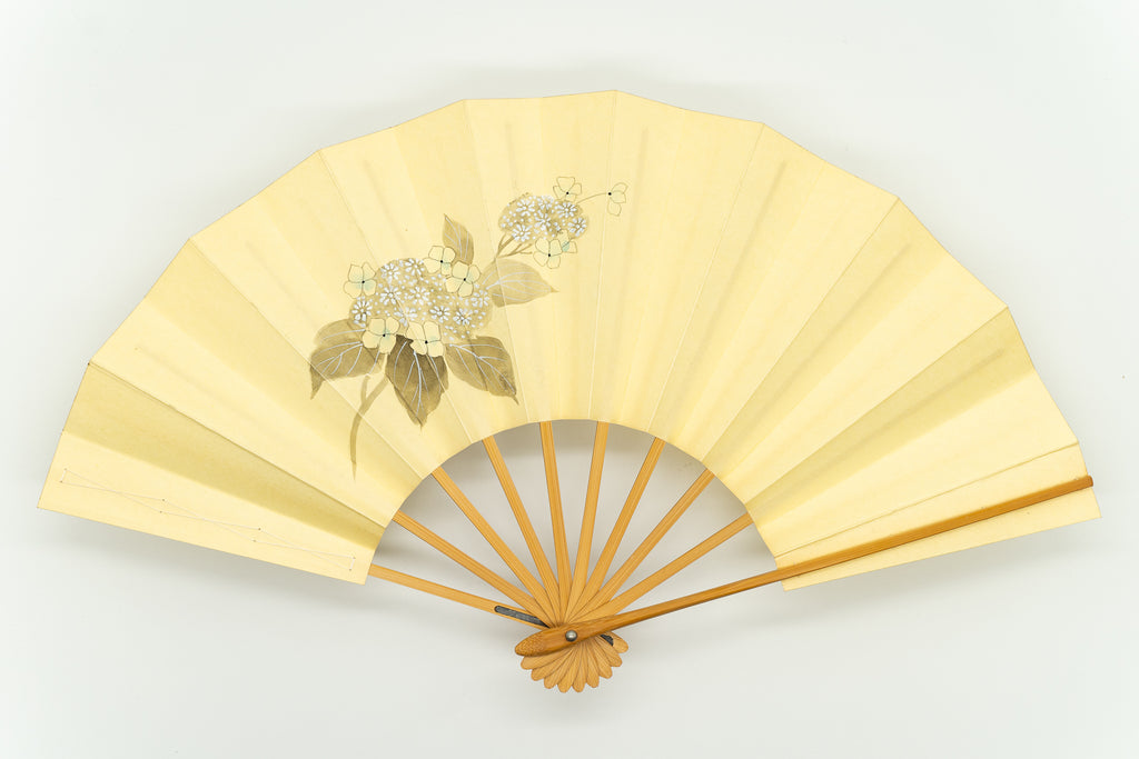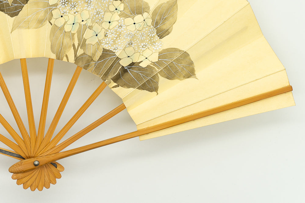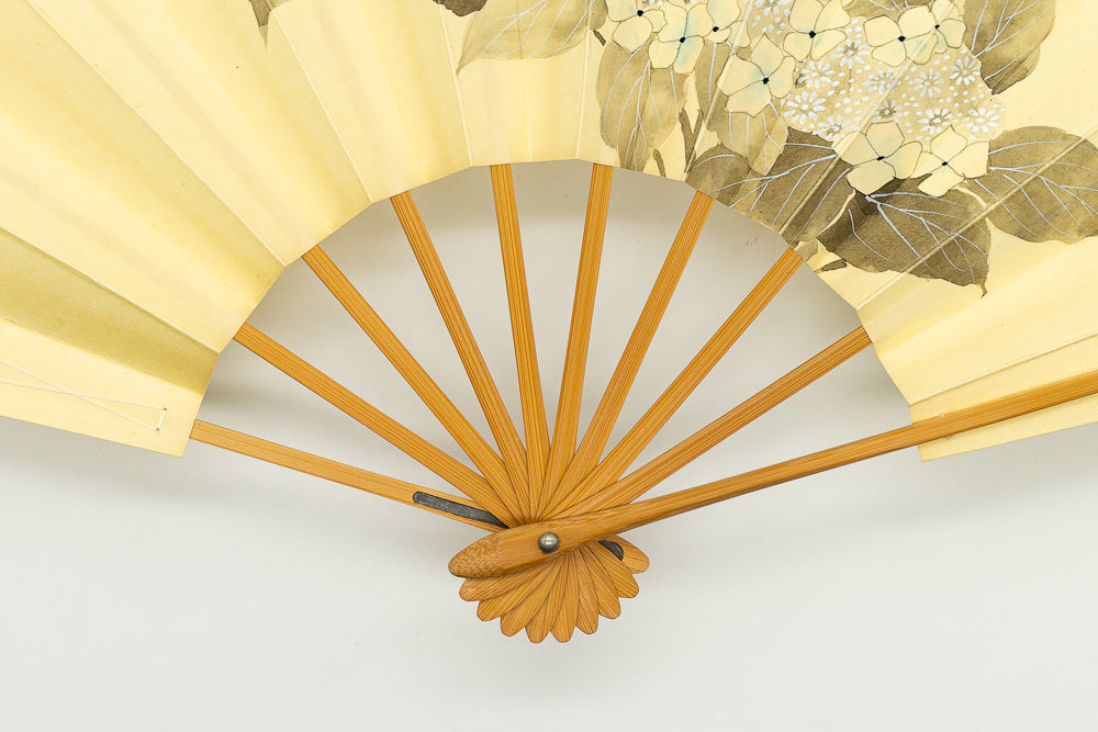 【ビンテージ】鳥の子地に墨絵調の紫陽花が描かれています。落ち着いた色調の中で白い花がアクセントになっています。骨は白竹で上品に仕立てました。