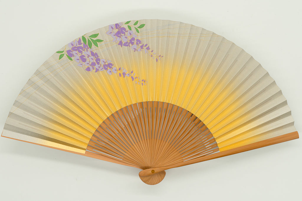 ゴールドグラデーションにやわらかな花房を風に揺らす藤の花が調和し、心を和ませてくれる優雅な扇子です。