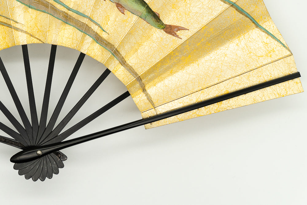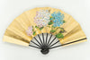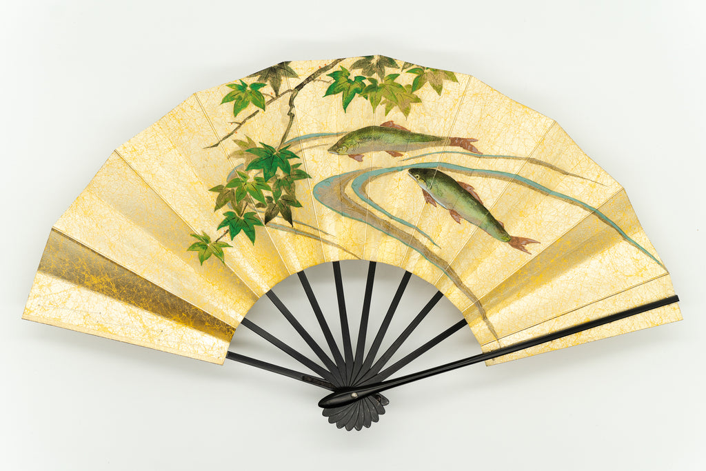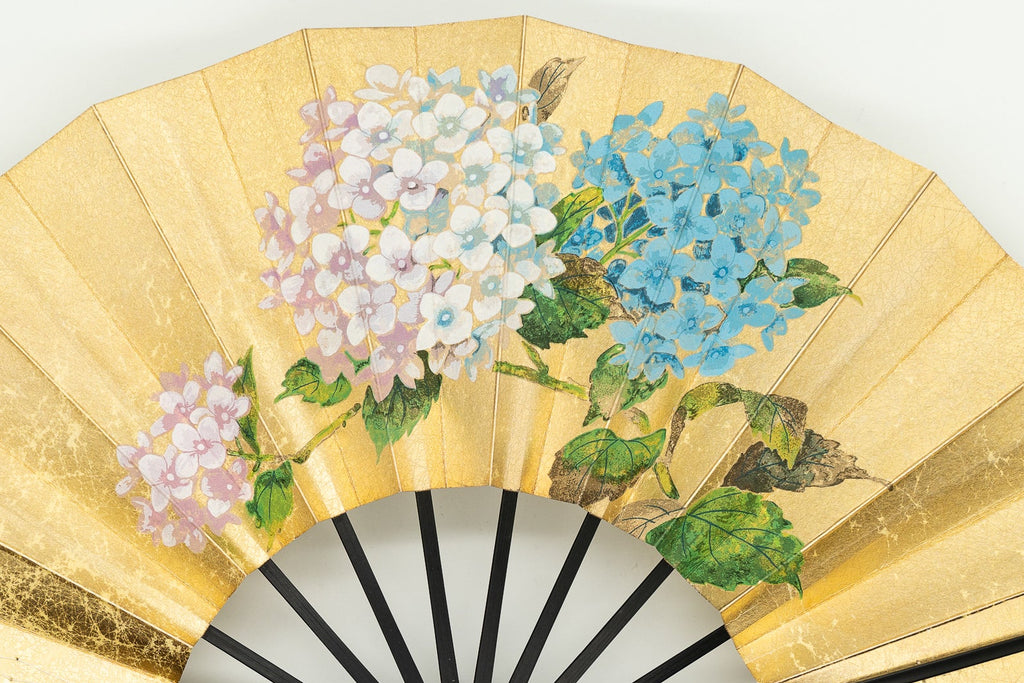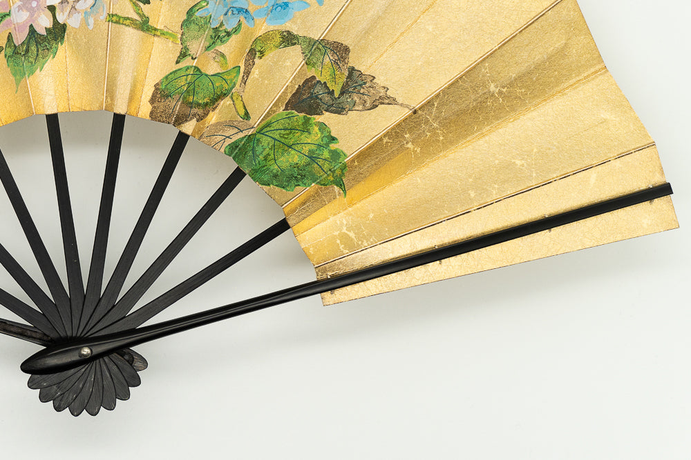 上質な金もみ地に柔らかな色調の紫陽花を手描きで絵付けし、エレガントな雰囲気に仕上がっています。もう片面には涼やかな鮎ををあしらい、両面お使い頂けます。
