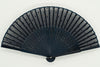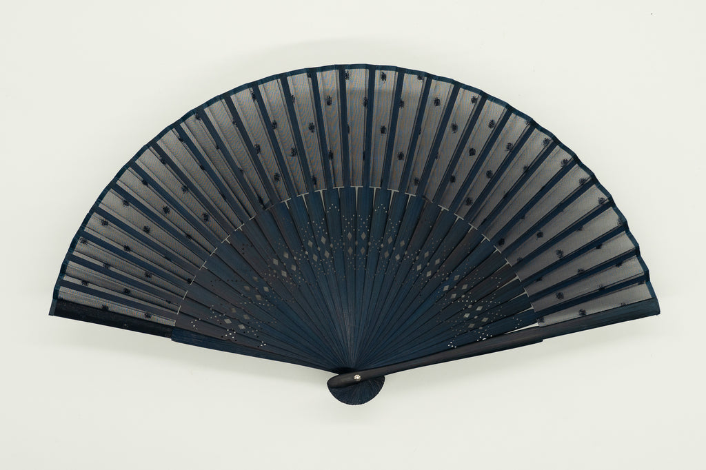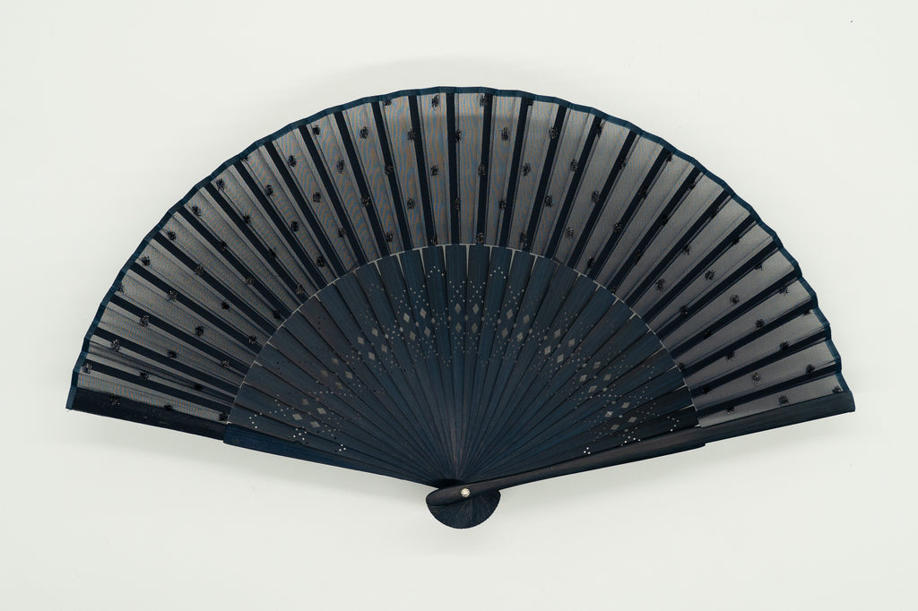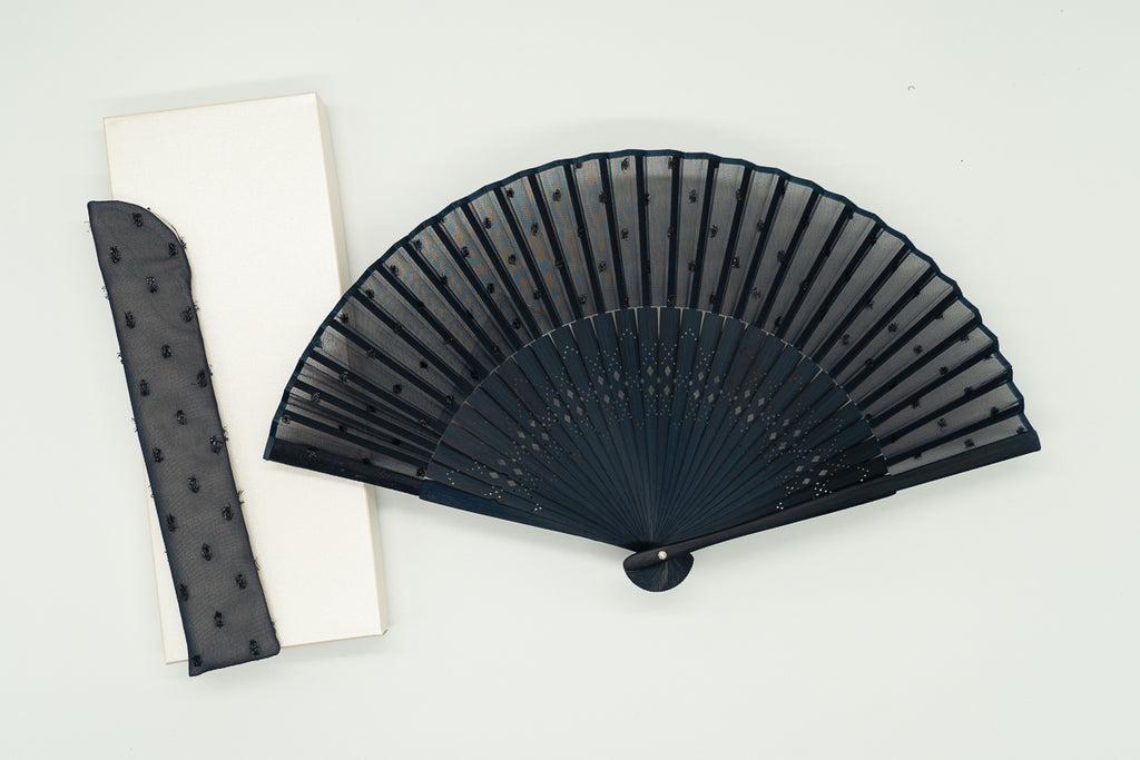 The glossy film-infused fabric shimmers subtly, and the fan ribs are accented with beautifully delicate diamond-pattern carvings. The accompanying fan case is made from the same fabric as the fan.
