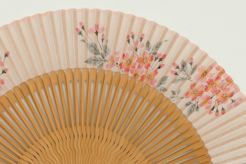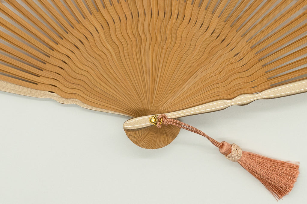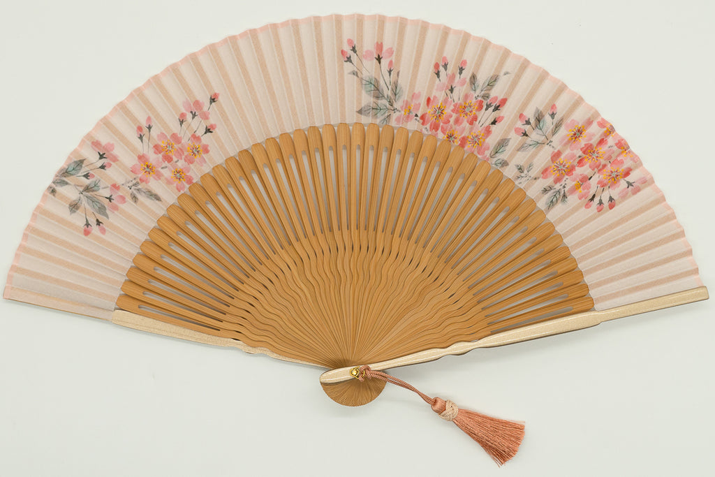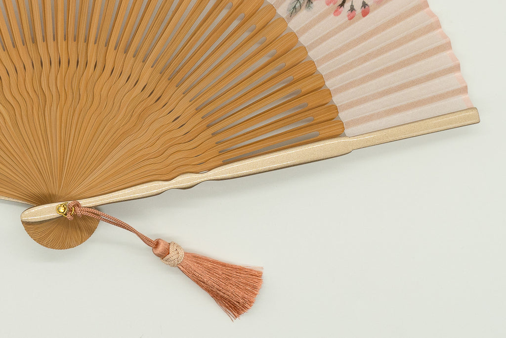 The elegant hand-painted print, employing Rimpa-style composition and tarashikomi technique, blends beautifully into any scene. The lustrous, pearl-coated main ribs add a touch of glamour, and a pink tassel sways with every flutter. The matching fan case also features cherry blossom embroidery.