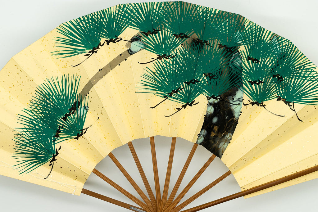 鳥の子地の扇面に一面金砂子振り、手描きで松が描かれています。