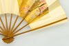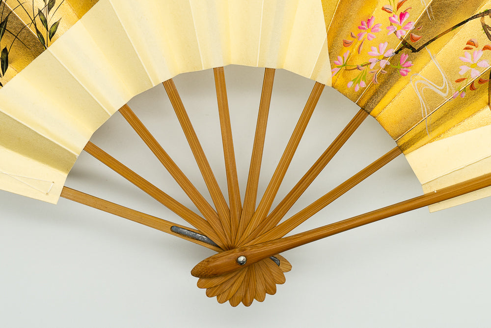 【ビンテージ】鳥の子地の扇面に金箔色紙に四季の花が手描きで描かれています。両面お使い頂け、季節に合わせて梅、桜、藤、桔梗の絵柄が楽しめる一品です。