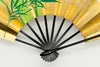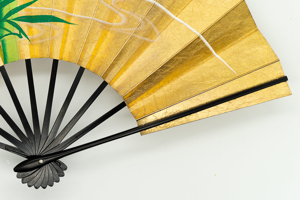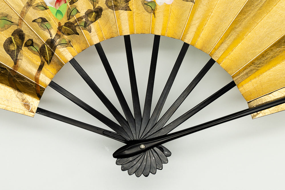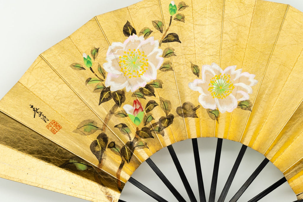 【一点もの】金箔を手で揉みこんで扇面に箔押した金もみ地に椿、もう片面には竹が手描きで描かれています。季節や用途に応じて両面でお使い頂けます。