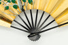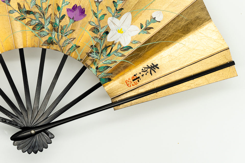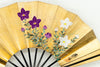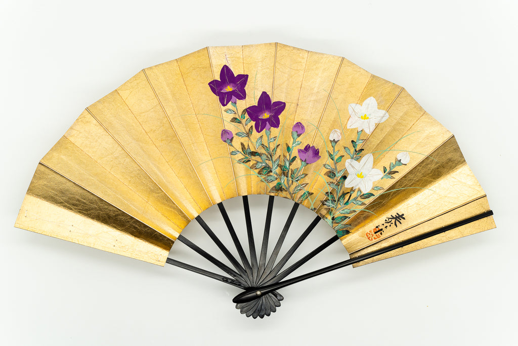 【一点もの・ビンテージ品】金箔を手で揉みこんで扇面に箔押した金もみ地に雪椿が手描きで描かれています。雪と白梅が可愛らしい椿の美しさを引き立たせています。もう片面には白と紫の桔梗が描かれています。用途に応じて両面お使い頂けます。ゴールドが経年変化によりシックなお色味になっており、ビンテージ品らしい趣を楽しんで頂ける一品です。