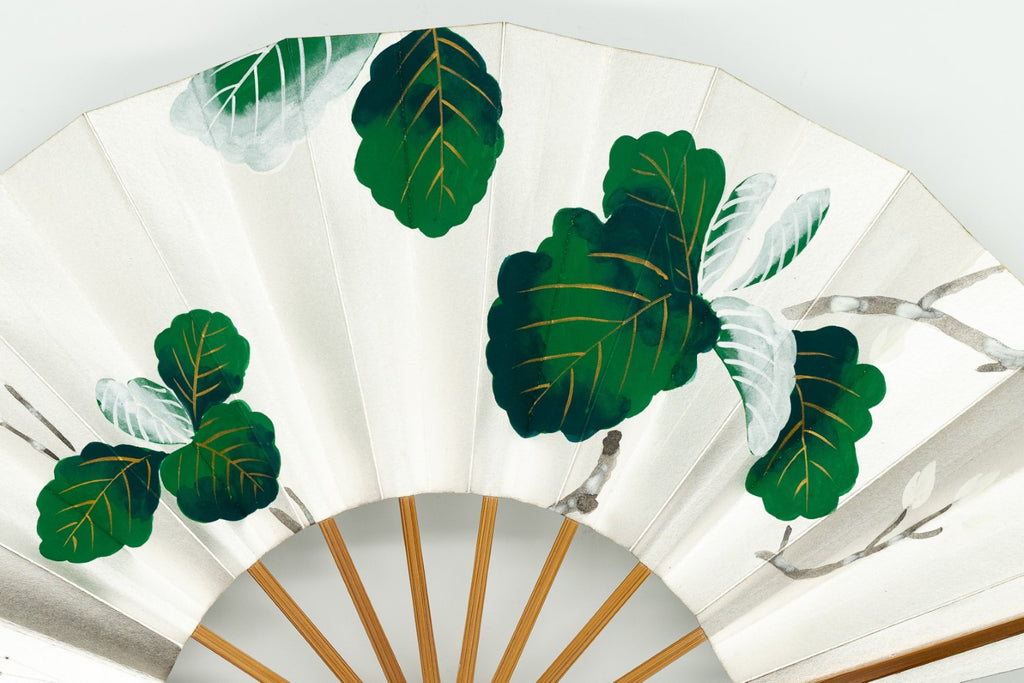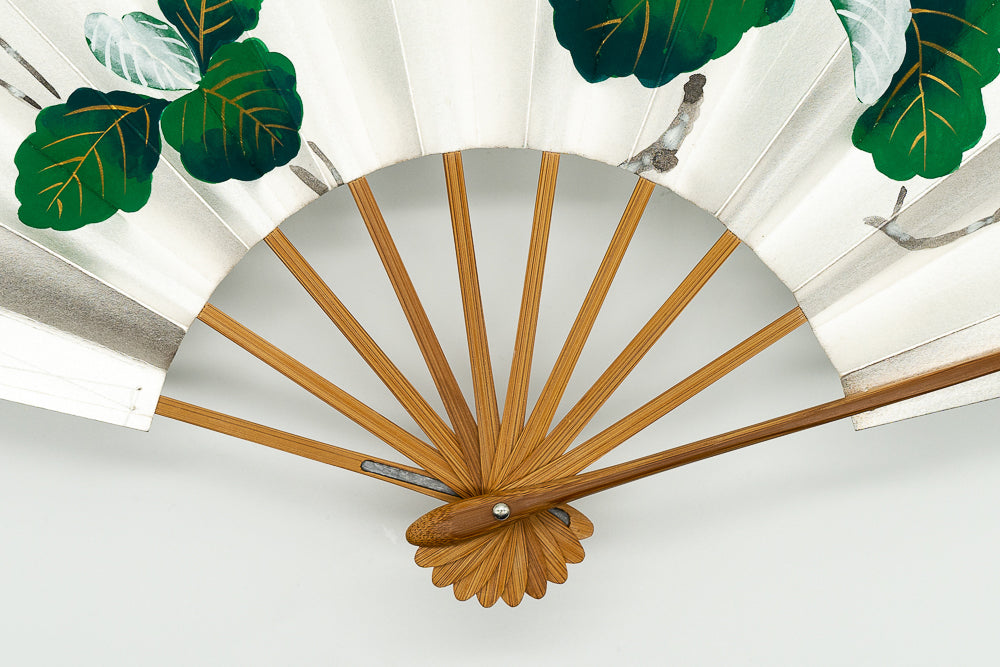 【ビンテージ品】銀ハキ地に波打つような葉の形が印象的な柏の葉が色鮮やかに描かれています。柏は秋になっても落葉せず新しい芽が出るまで葉が落ちないことから子孫繁栄を願う縁起物とされています。