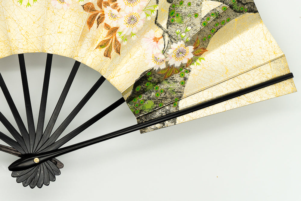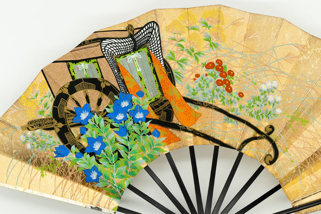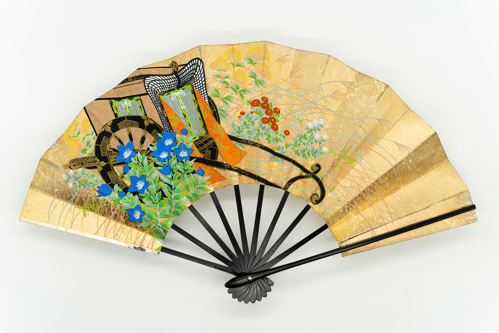 上質な金もみ地に落ち着いた上品な色調の桜、もう片面には御所車と秋草があしらわれています。季節に合わせて通年ご利用頂けます。