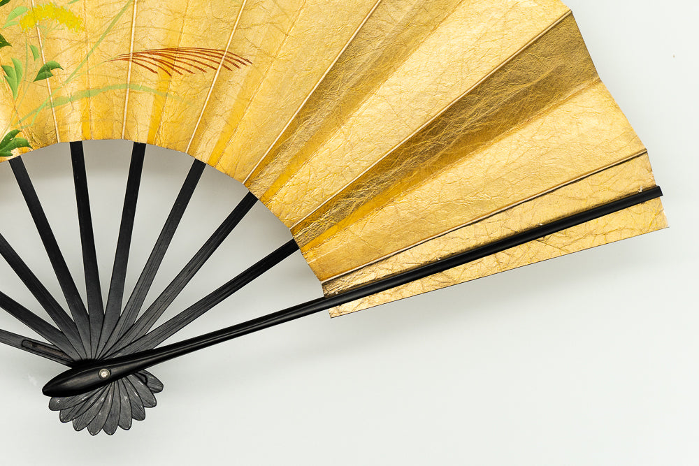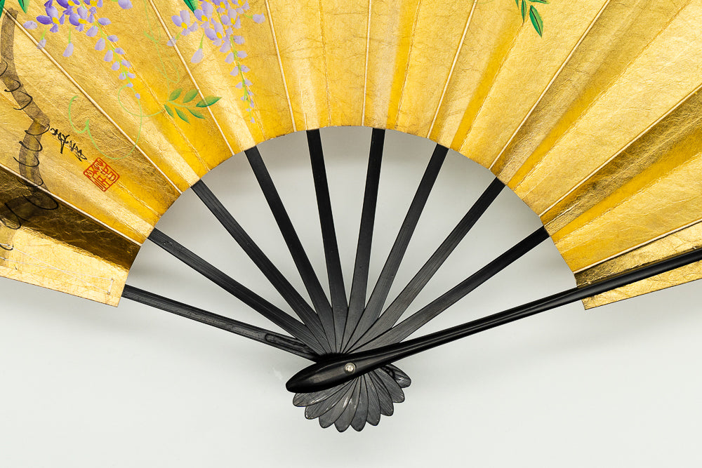 【一点もの・ビンテージ品】金箔を手で揉みこんで扇面に箔押した金もみ地に藤の花、もう片面には桔梗が描かれています。表と裏が違うデザインとなっており、雰囲気や季節に合わせて両面でお楽しみいただけます。