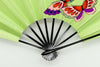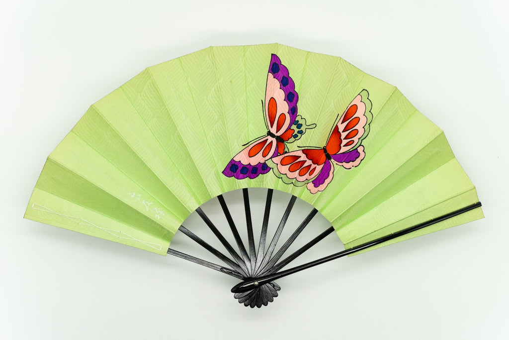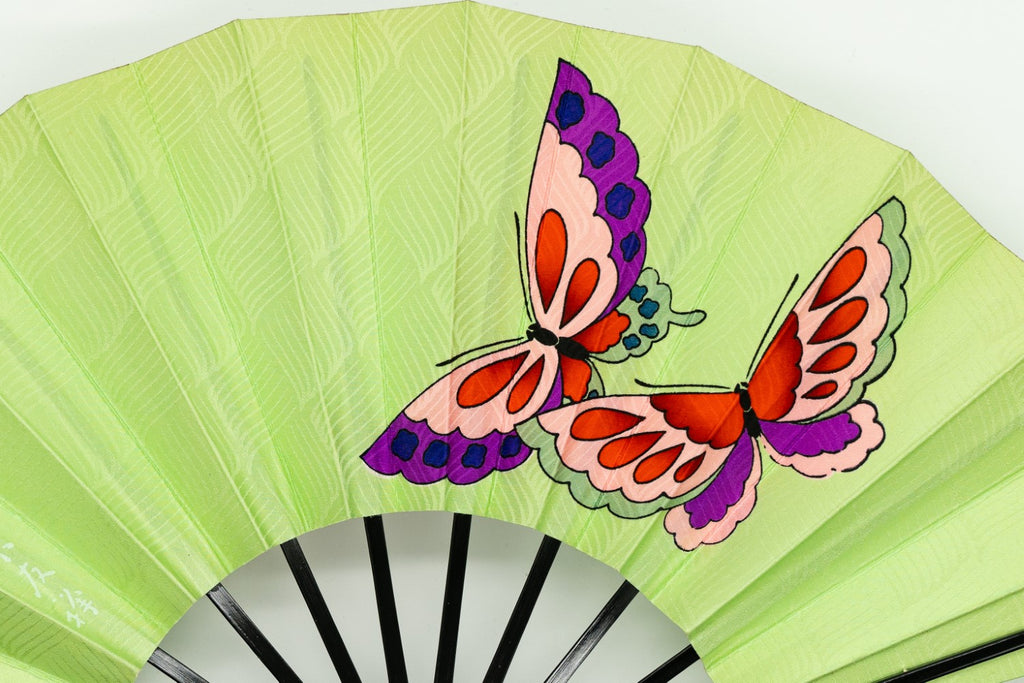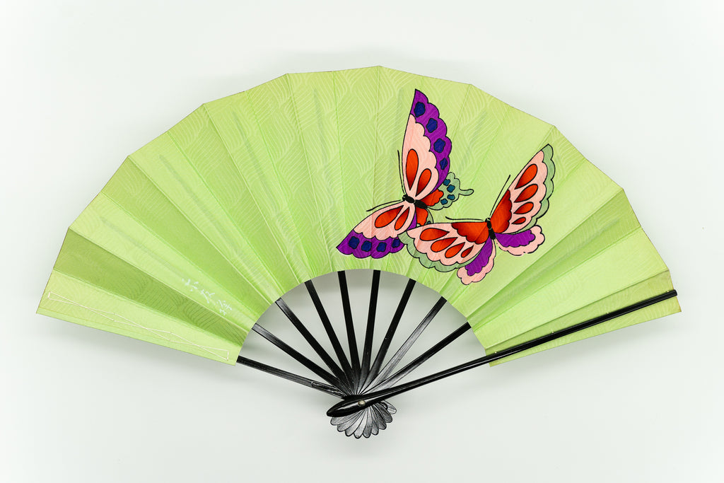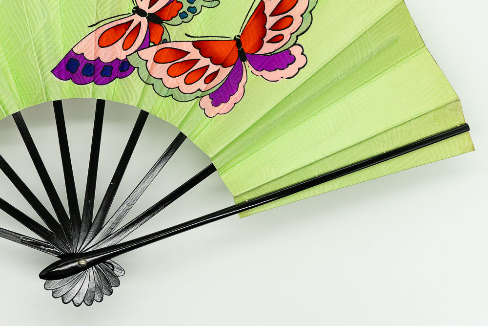 京友禅を扇に仕立てた珍しいお品です。布地ならではの質感が印象的で鮮やかな蝶が舞い、ポップな印象で個性溢れる一品となっています。