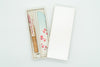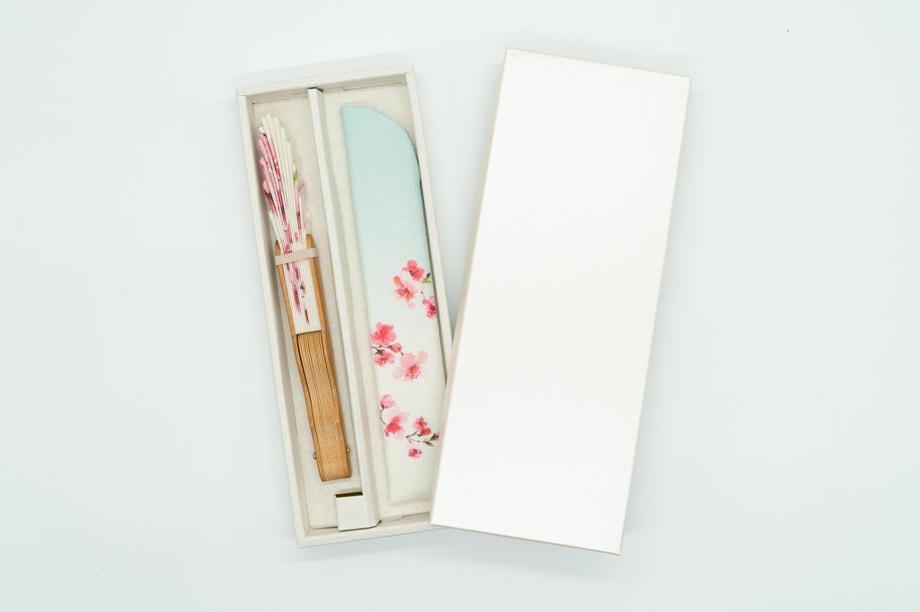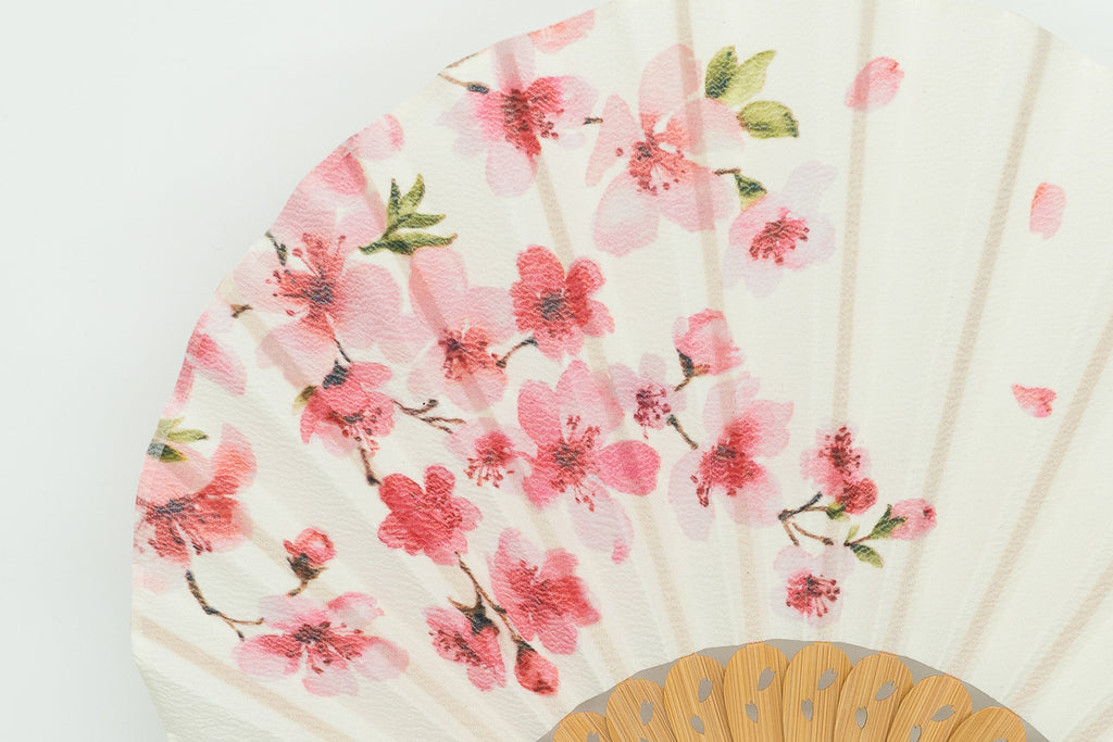 This design refreshingly depicts cherry blossoms in their charming full bloom. The guard sticks are also subtly decorated with cherry blossom petals. The case also features a matching design to the fan.
